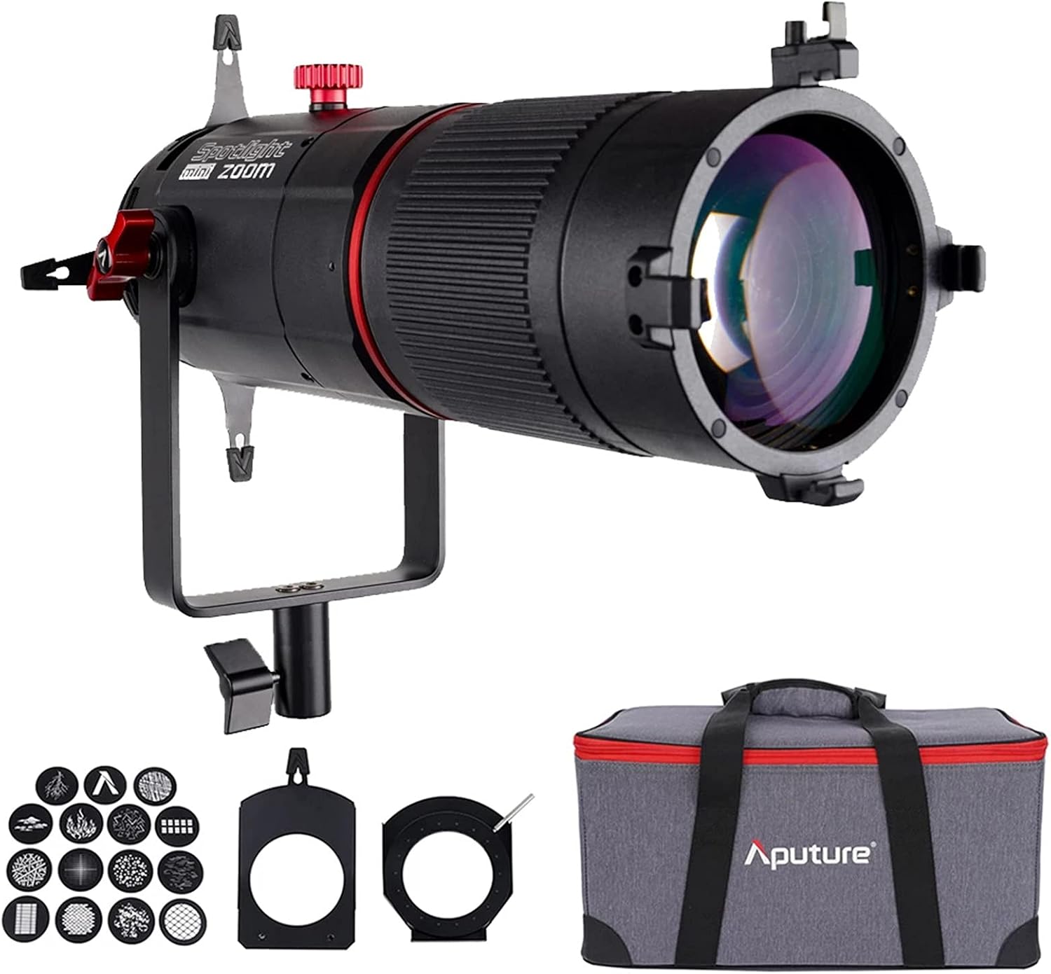 - Aputure Spotlight Mini Zoom là thấu kính chiếu góc chùm tia có thể điều chỉnh được, được thiết kế cho đèn LED hội tụ LS 60d và LS 60x. Bằng cách lắp LS 60d hoặc 60x vào Spotlight Mini Zoom, bộ đèn kết hợp này mang đến cho người dùng khả năng định hình lại hoàn toàn hình dạng ánh sáng của mình.