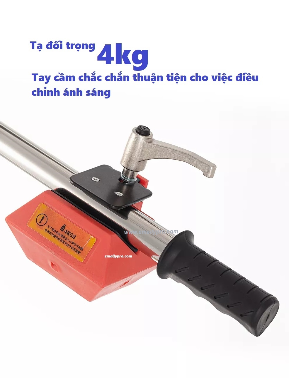 Sản phẩm bao gồm: một bộ chân đèn và tay boom xoay góc ống inox, một tạ đỏ 5kg.