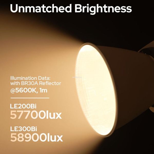 Godox ra mắt Litemons LE200Bi với đèn LED COB mềm mại, đồng thời sở hữu độ sáng dồi dào cho nhu cầu sử dụng chuyên nghiệp. Chip LED cao cấp của đèn có khả năng phát ra ánh sáng lên đến 57.700 lux ở khoảng cách 1 mét (3,3 feet) nhờ chóa đèn đi kèm ở mức nhiệt độ màu CCT 5600K. Đèn 220W này tạo ra chất lượng ánh sáng rộng, đồng đều, chỉ số hoàn màu CRI 98 và TLCI 98 chính xác, cùng khả năng điều chỉnh độ sáng từ 0 đến 100%. Với dải nhiệt độ màu kép từ 2800 đến 6500K, bạn có thể dễ dàng kết hợp đèn với cả nguồn sáng ban ngày và đèn spotlight