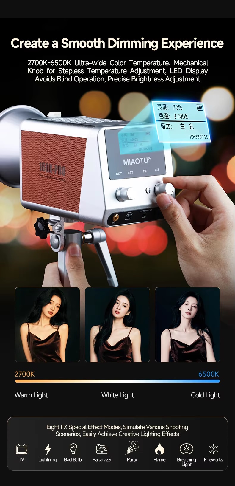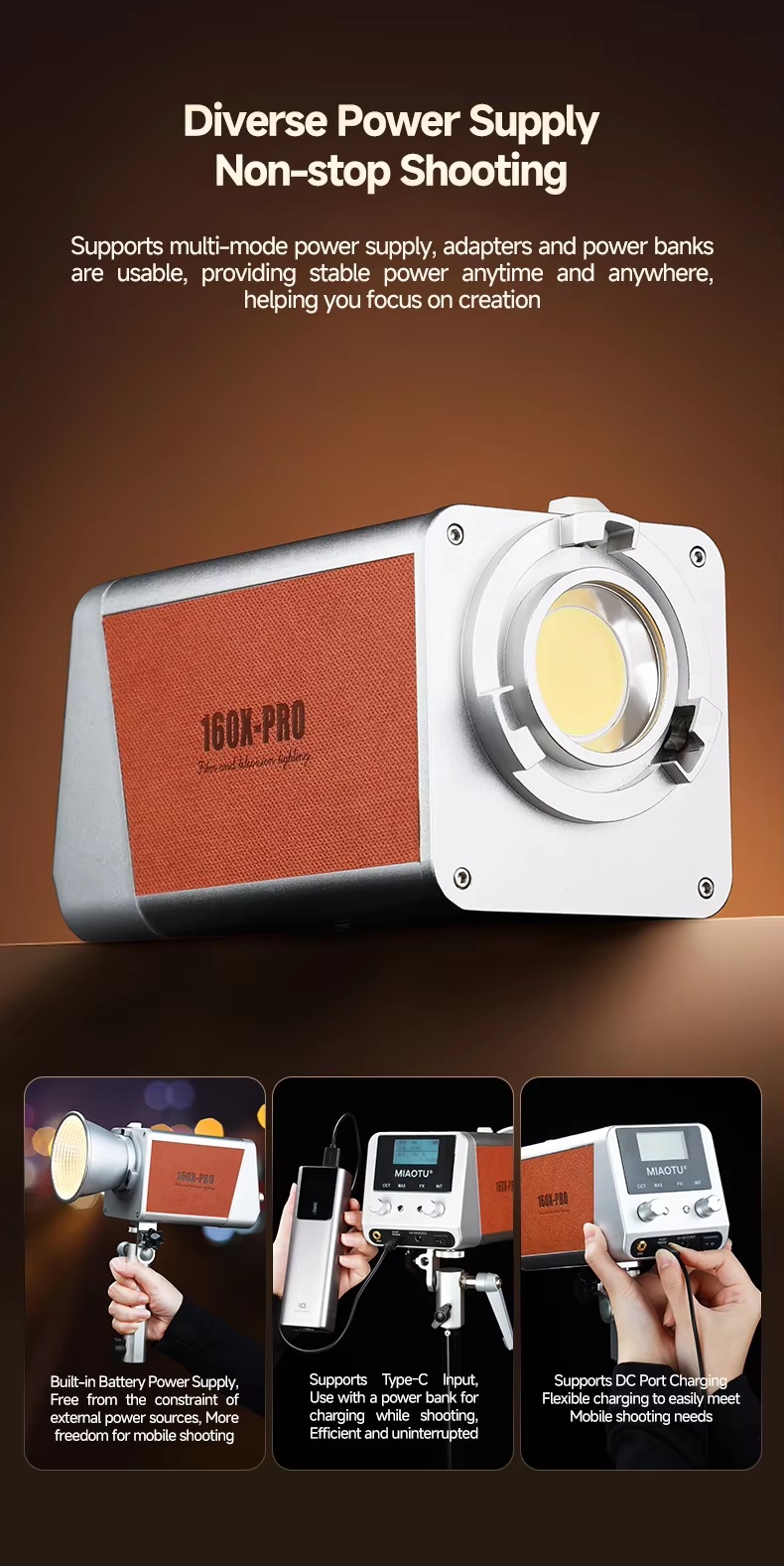 Giới thiệu tổng quan MIAOTU 160W là giải pháp chiếu sáng chuyên nghiệp dành cho nhiếp ảnh, quay phim và các concept ngoài trời. Với thiết kế hiện đại kết hợp chất liệu cổ điển, sản phẩm không chỉ mang lại hiệu năng mạnh mẽ mà còn tạo nên phong cách sang trọng, tinh tế.