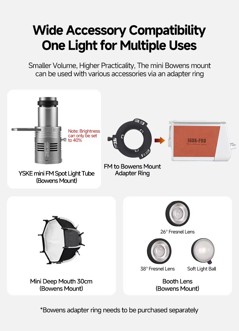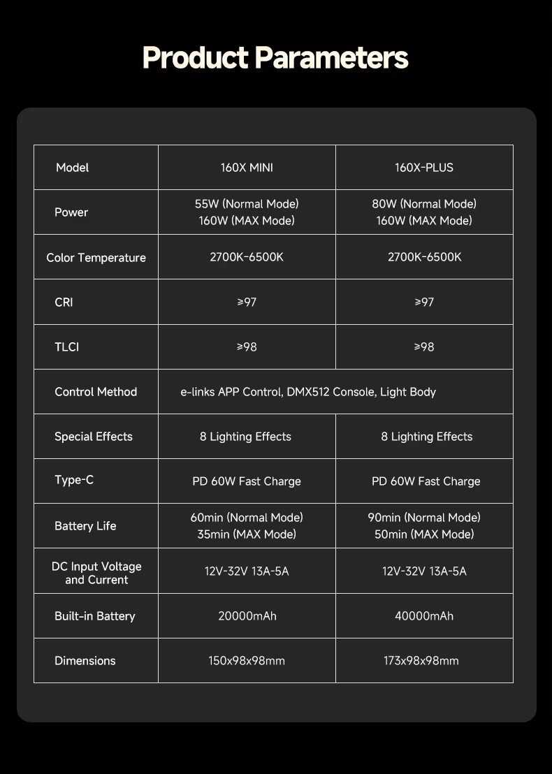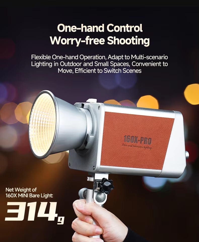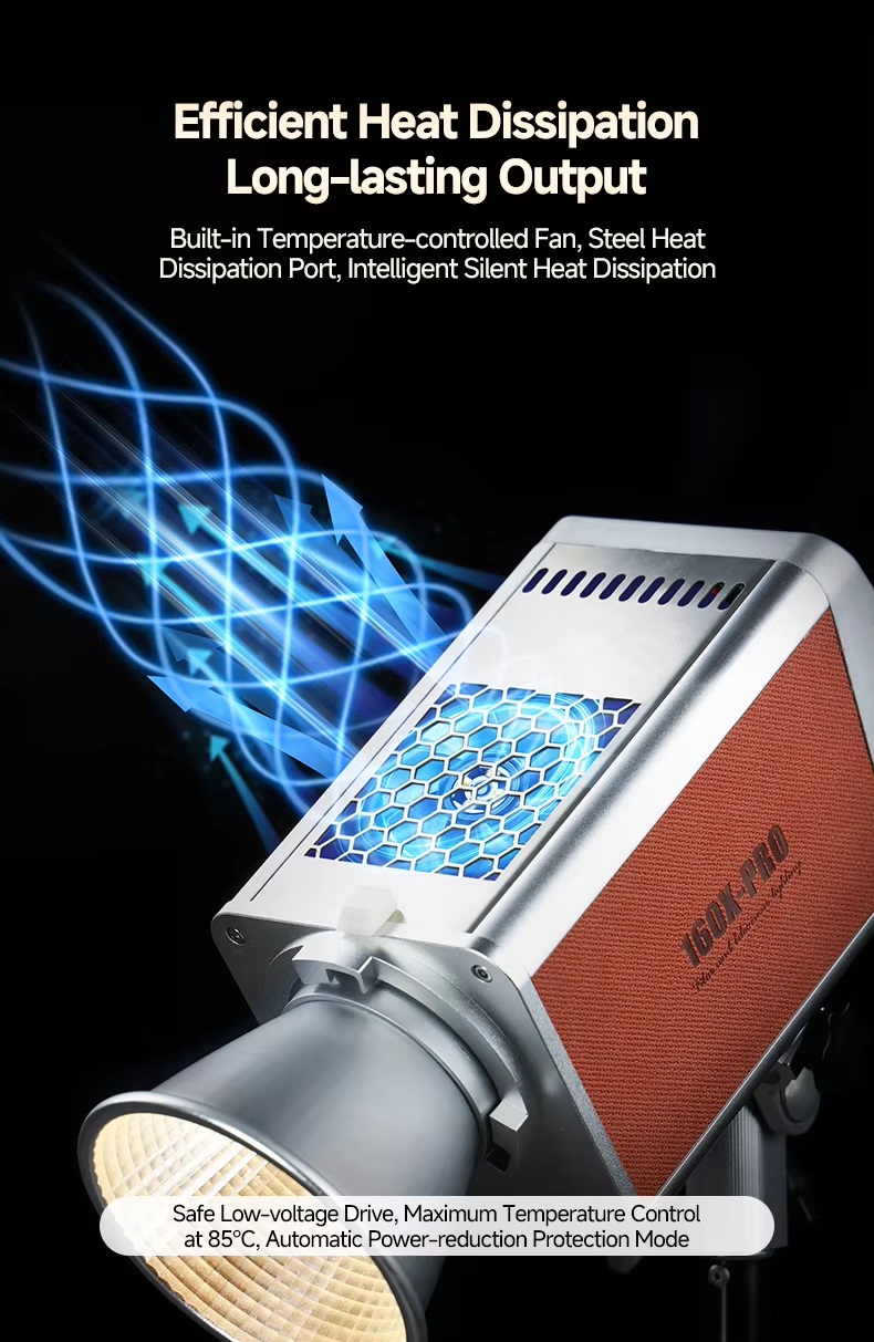 Công suất mạnh mẽ 160W, đủ để đáp ứng nhu cầu chiếu sáng chuyên nghiệp.