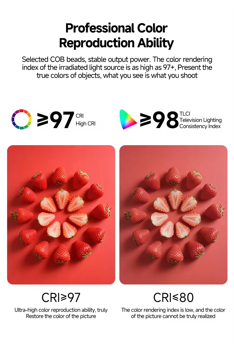Chỉ số hoàn màu CRI ≥ 97, tái hiện màu sắc trung thực, phù hợp cho chụp chân dung, sản phẩm và video nghệ thuật.