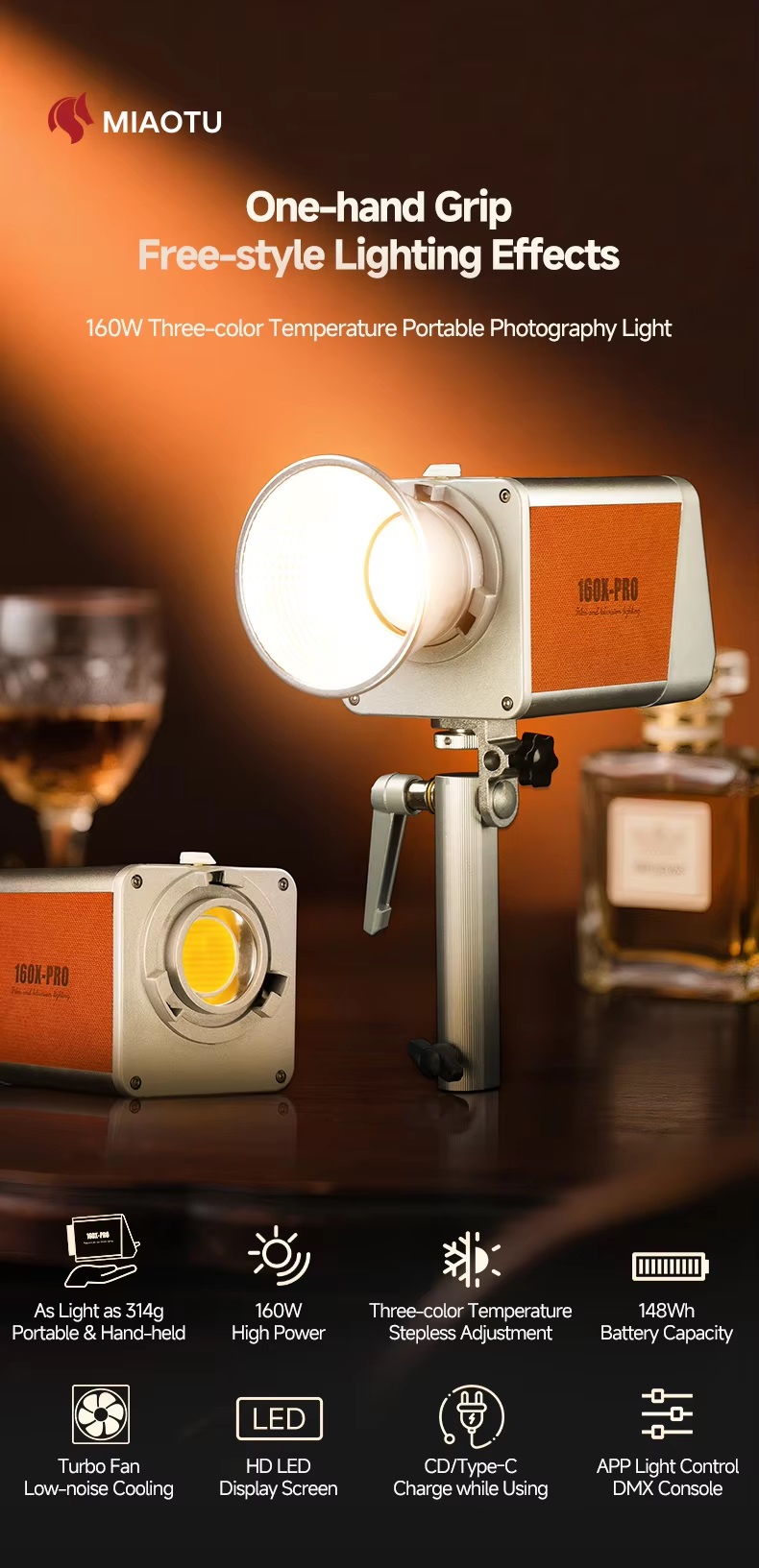 Đèn LED MIAOTU 160W – Pin 20000mAh, CRI ≥97, nhiệt độ màu 2700-6500K