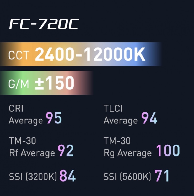 Thiết bị nhỏ gọn, sử dụng nguồn điện AC này có bộ nguồn riêng biệt, giúp cả hai bộ phận có kích thước cực kỳ nhỏ gọn. Với thiết kế vỏ trên hình cánh sáng tạo của Nanlite, FC720C nổi bật so với các thiết bị đèn LED tiêu chuẩn khác. Cung cấp hiệu suất ánh sáng ấn tượng, nó đảm bảo khả năng tái tạo màu sắc trung thực với chỉ số CRI 95 và TLCI 94, đồng thời cung cấp các tính năng tiên tiến với điều khiển trực quan trên thiết bị và từ xa.