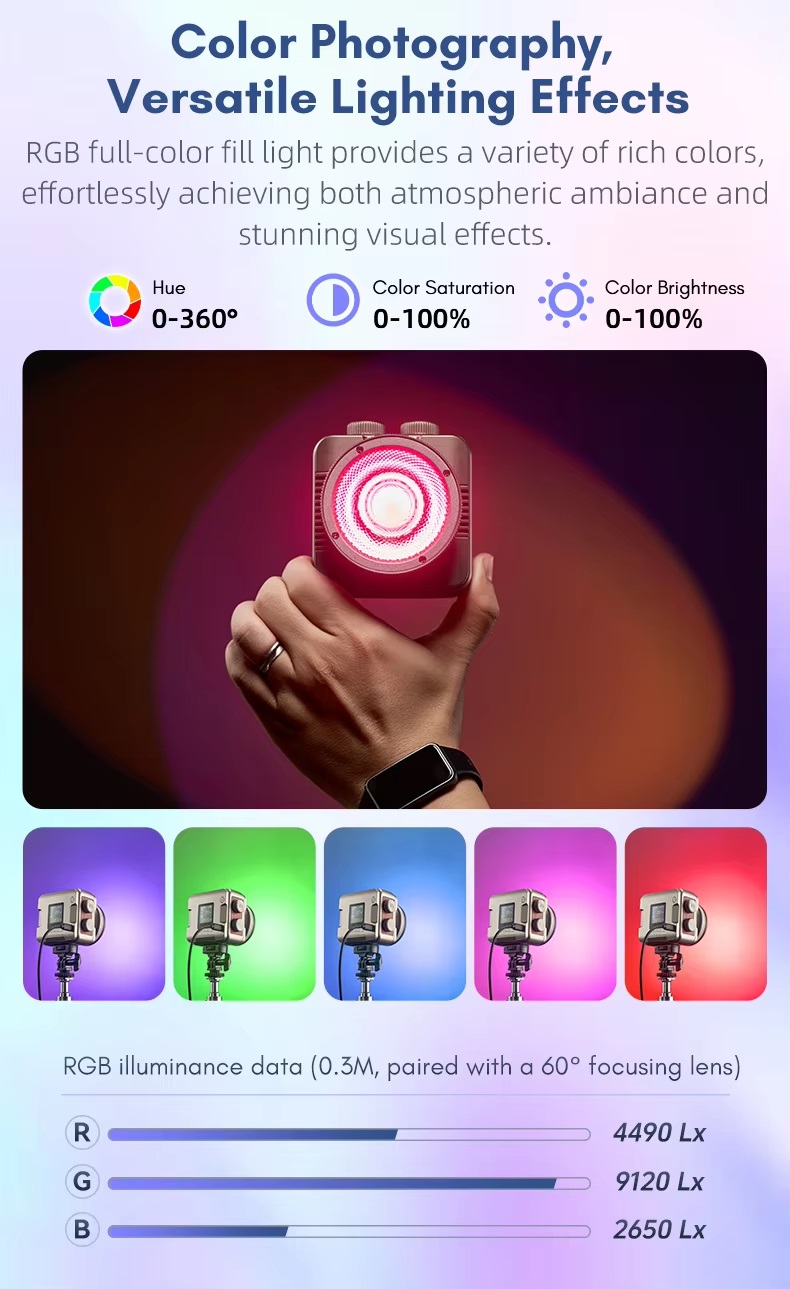 Màu sắc RGBWW chân thực – Dải CCT có thể điều chỉnh hoàn toàn từ 2700K đến 6500K, cùng với khả năng điều chỉnh màu HSI cho khả năng sáng tạo vô tận.