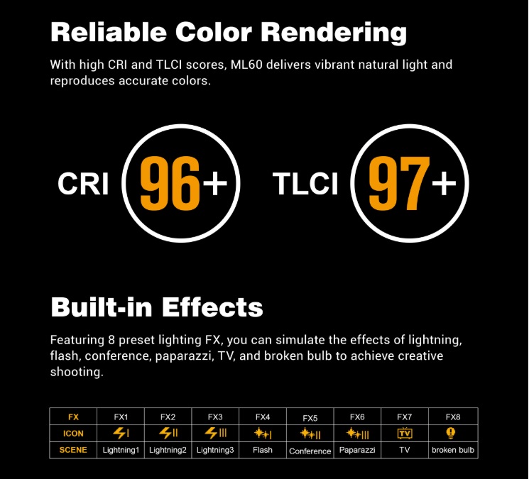 ML60 mang lại ánh sáng tự nhiên sống động và tái tạo màu sắc chính xác nhờ chỉ số hiển thị CRI và TLCI cao (CRI=96+ và TLCI=97+)