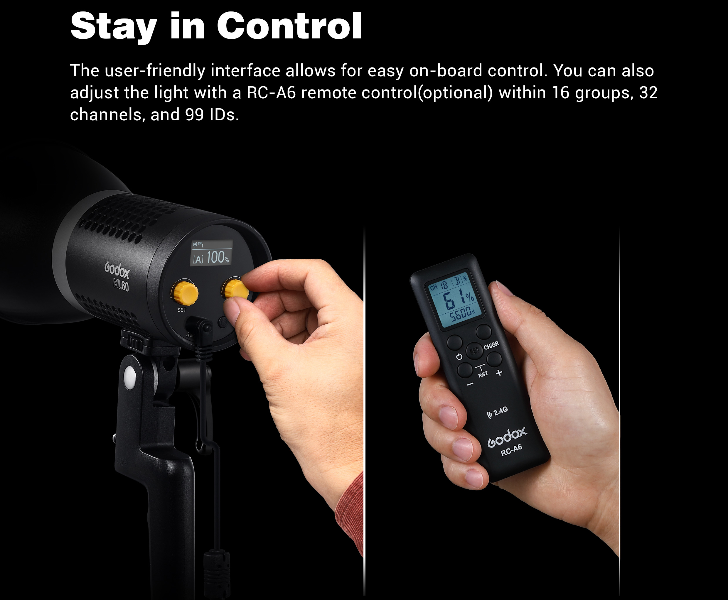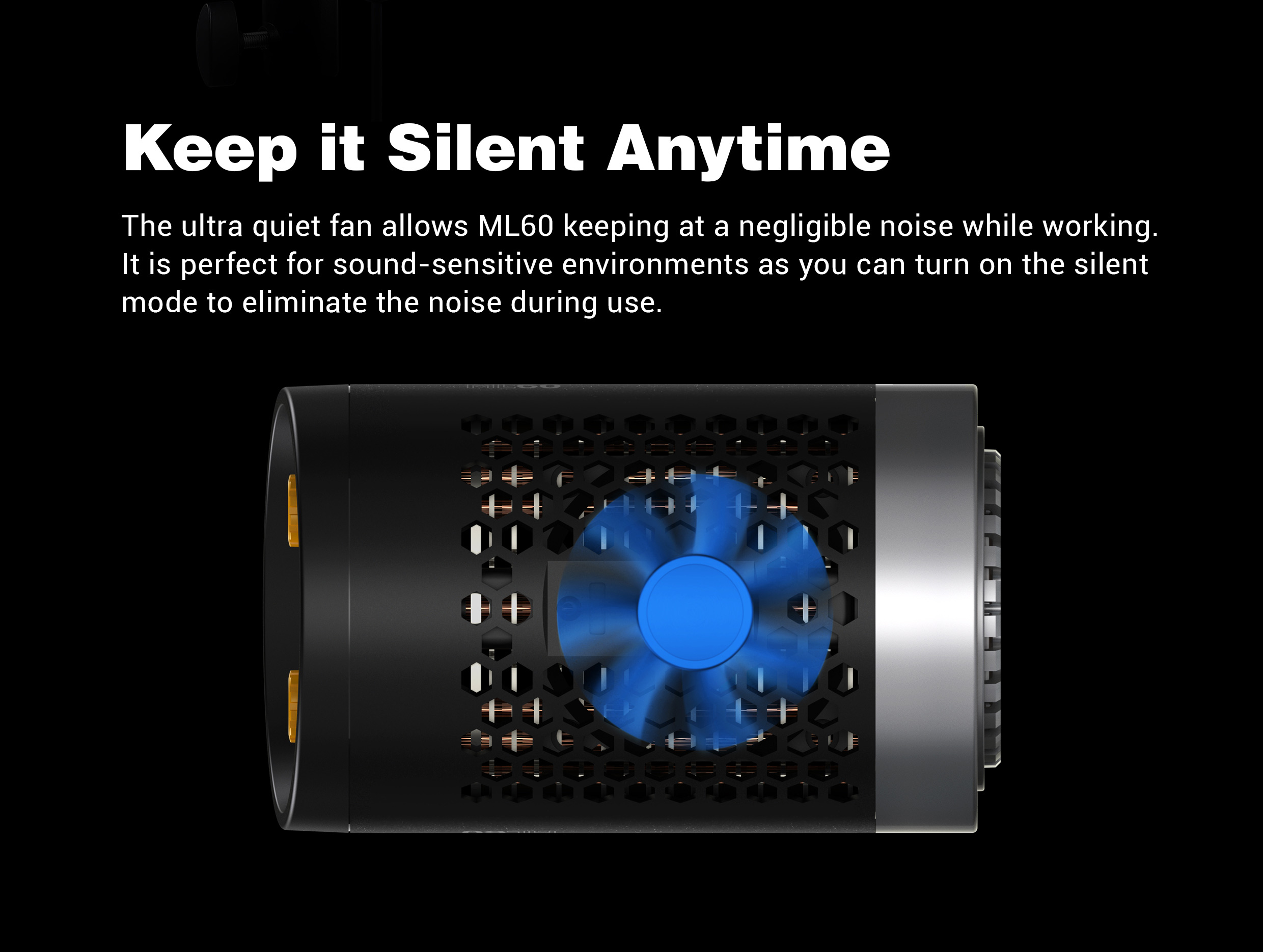 ML60 mang lại cảm giác vô cùng ấn tượng với việc tạo ánh sáng chuyển động ngoài trời hay trong nhà .Với lợi thế nhỏ gọn đi kèm tay cầm thuận tiện thích hợp pin NP-F 970 thông dụng ấn tượng với trọng lượng 0,8kg rất thuận tiện khi sử dụng ngoài studio .