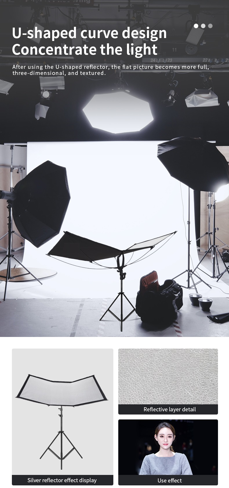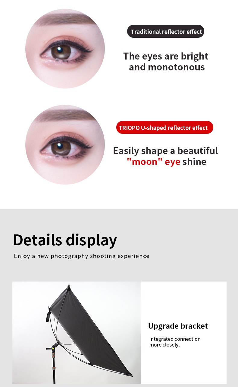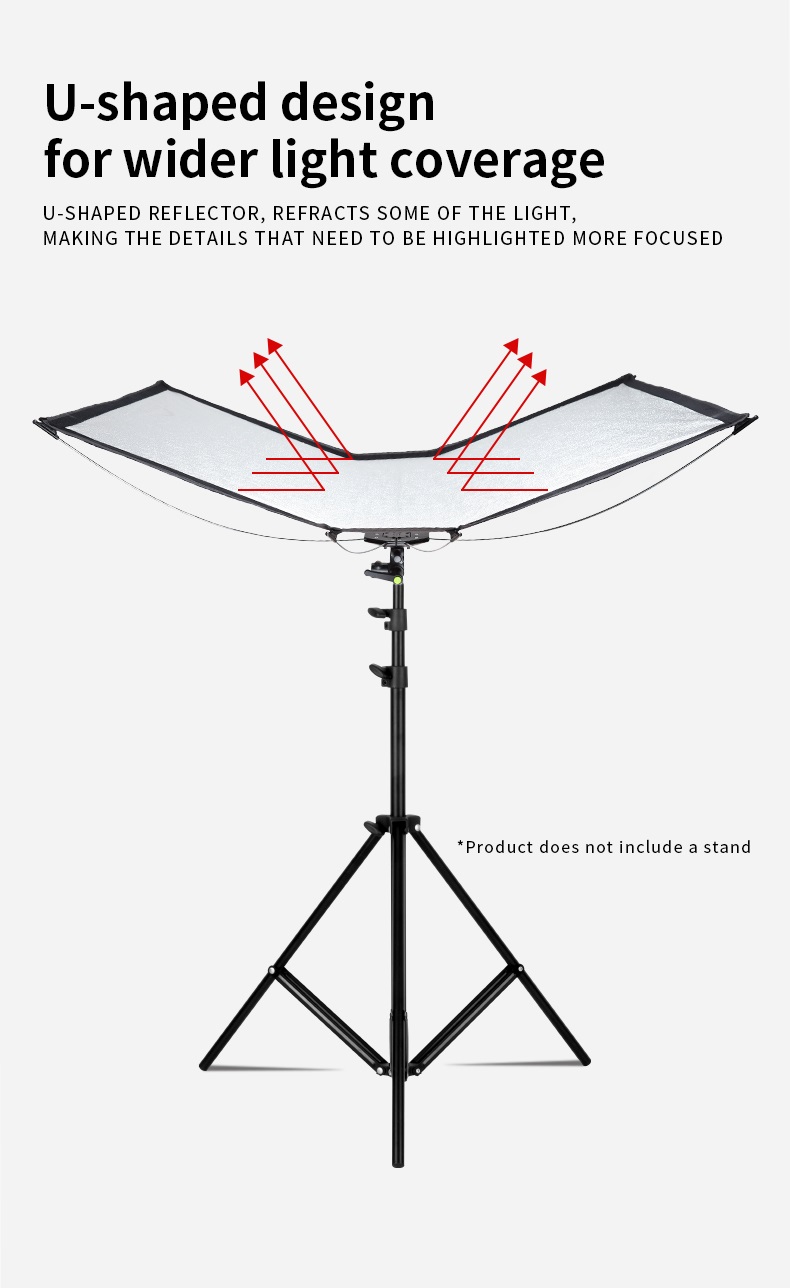 - Thiết kế hình chữ U độc đáo: Tấm phản quang hình chữ U cho phép nhiếp ảnh gia thiết lập ánh sáng dạng vỏ sò chỉ với một đèn, tạo hiệu ứng ánh sáng tập trung và ấn tượng hơn.