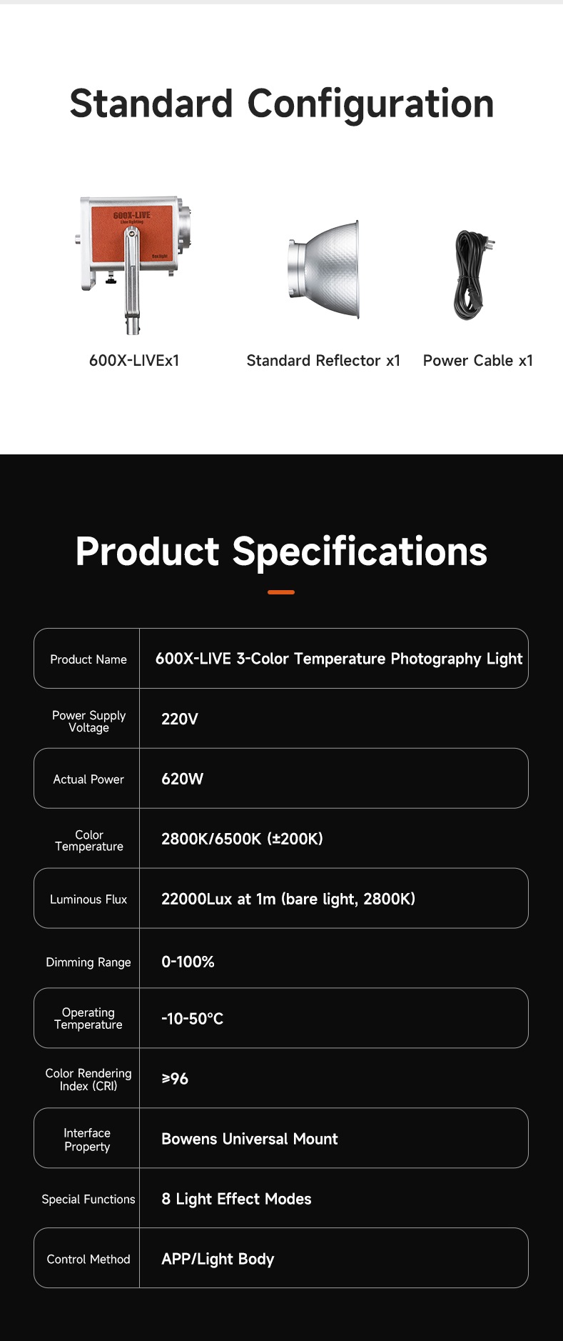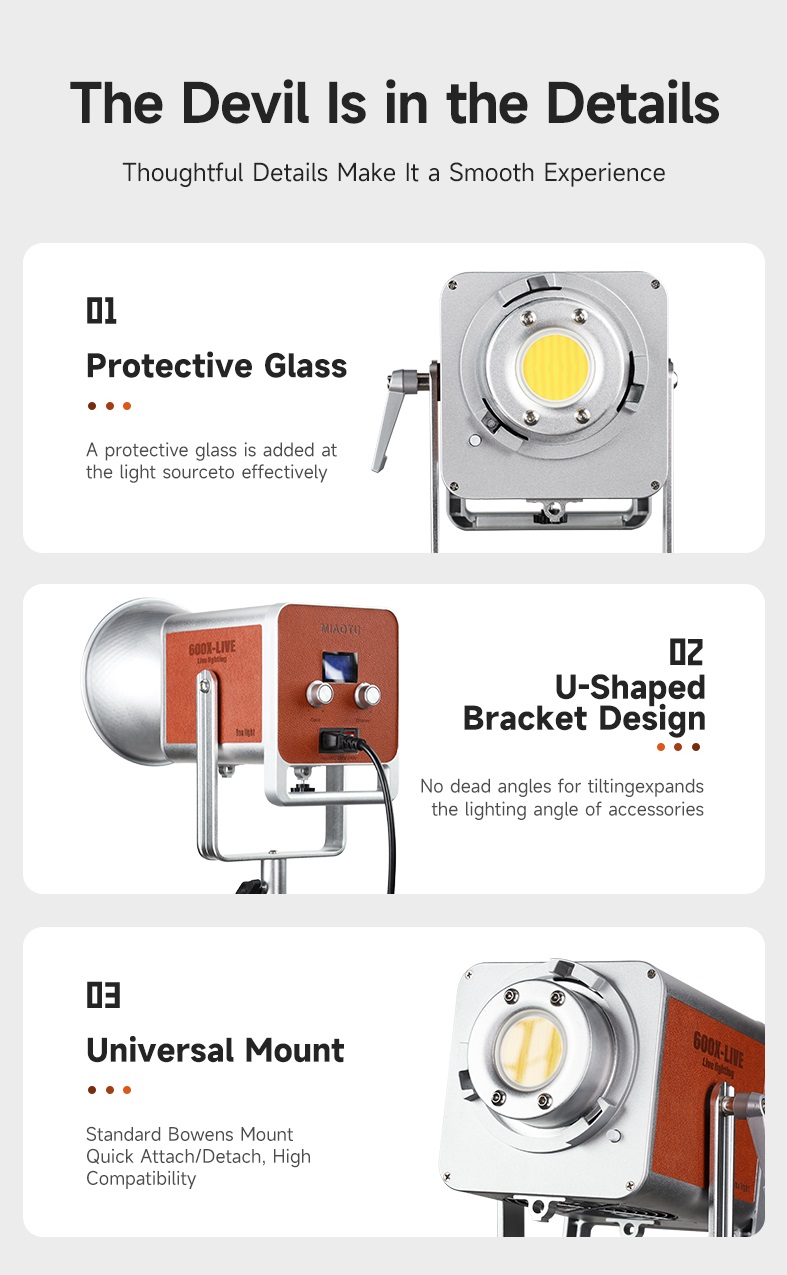 Miaotu LIVE-600B Professional là dòng đèn LED COB chuyên nghiệp, được thiết kế dành cho quay phim, chụp ảnh và livestream. Với công suất 600W, khả năng điều chỉnh nhiệt độ màu từ 2700K – 6500K, chỉ số hoàn màu CRI >97 và độ sáng mạnh mẽ, sản phẩm mang lại ánh sáng trung thực, sắc nét, giúp nâng cao chất lượng hình ảnh và video trong mọi bối cảnh.