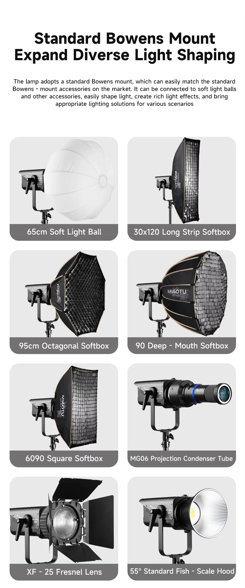 Công suất 300W: ánh sáng mạnh mẽ, phù hợp cho studio và sản xuất nội dung chuyên nghiệp.