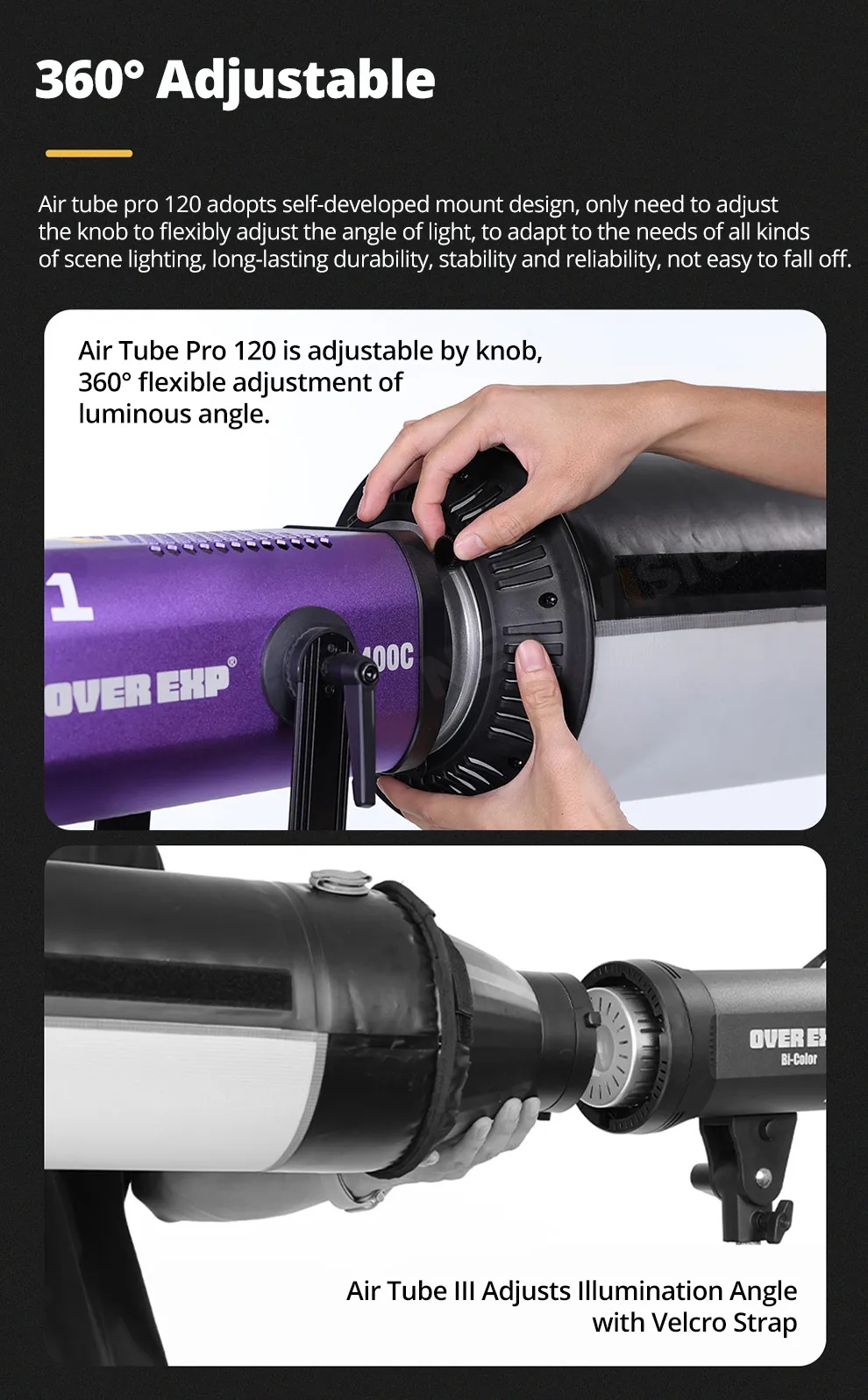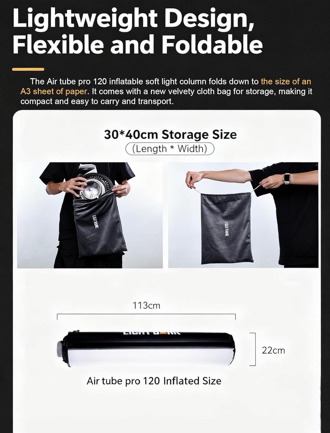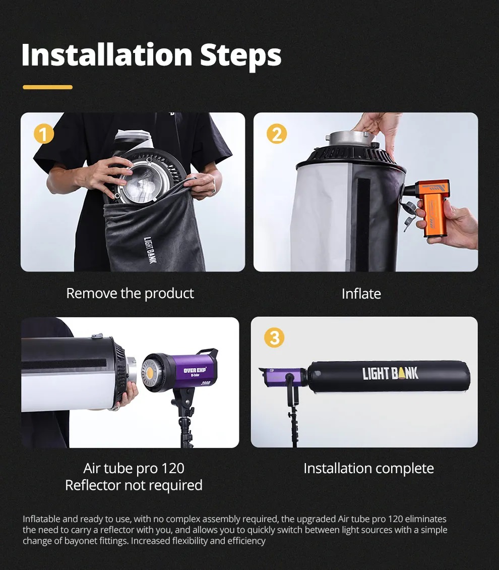 Softbox bơm hơi Air Tube Pro 120 với thấu kính Fresnel, có thể điều chỉnh 360°, hộp khuếch tán siêu rộng 210° dành cho đèn flash ngàm Bowens và đèn LED 500W, bơm hơi nhanh trong 30 giây
