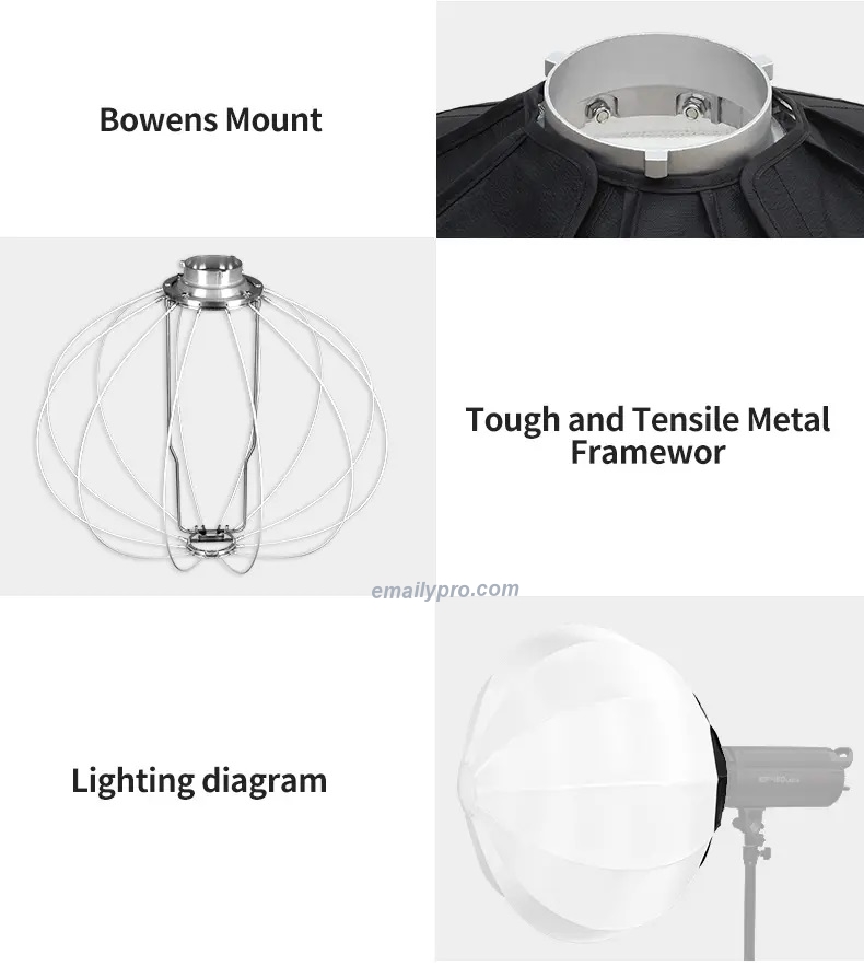 Softbox ball sử dụng ngàm Bowens phù hợp với hầu hết các loại đèn trên thị trường .