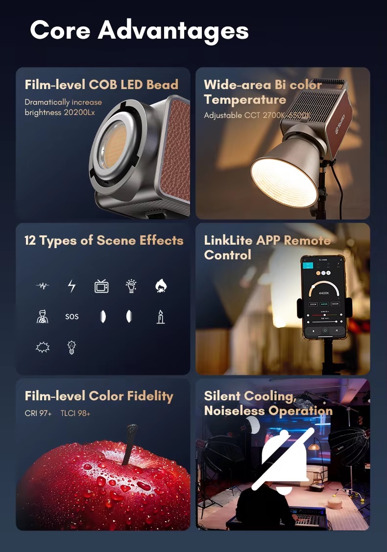 CRI cao (Ra ≥ 97): Đảm bảo màu sắc trung thực, tự nhiên, phù hợp cho quay phim, chụp ảnh sản phẩm và phỏng vấn.