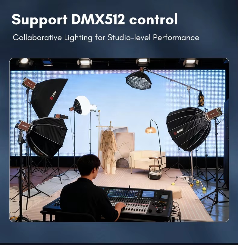 DMX512 Control: Hỗ trợ điều khiển qua hệ thống DMX512 chuyên nghiệp, dễ dàng đồng bộ với nhiều thiết bị khác trong studio.
